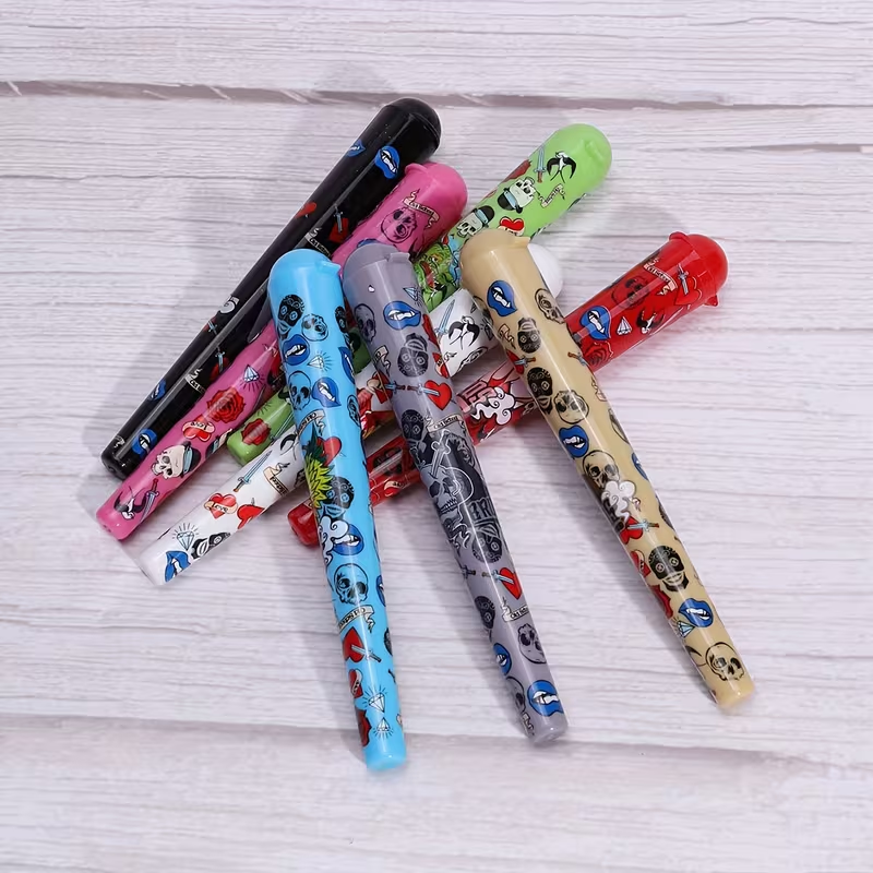 Colorful skull-themed pre-roll storage tube. Random color selection. Perfect for keeping pre-rolls fresh and protected.